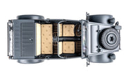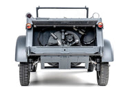This scaled down Type 82 Kubelwagen uses a brushed-motor that is housed within a detailed engine compartment. A scale two speed transmission allows for 2WD and 4WD engagement. Adding to the scale presence, the crankshaft pulley drives the generator pulley via rubber belt. The generator pulley is tied to the cooling fan for added scale realism. The start button is mounted to the lower left corner of the dashboard behind the functional steering wheel. All of these features and functions come together for one awesome scale truck.
